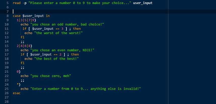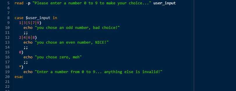 user_inputis either 1 (this symbol --> | means "or" here) or 3 or 5 or 7 or 9 then execute the code in this block...- echo to the screen our distaste of odd numbers.